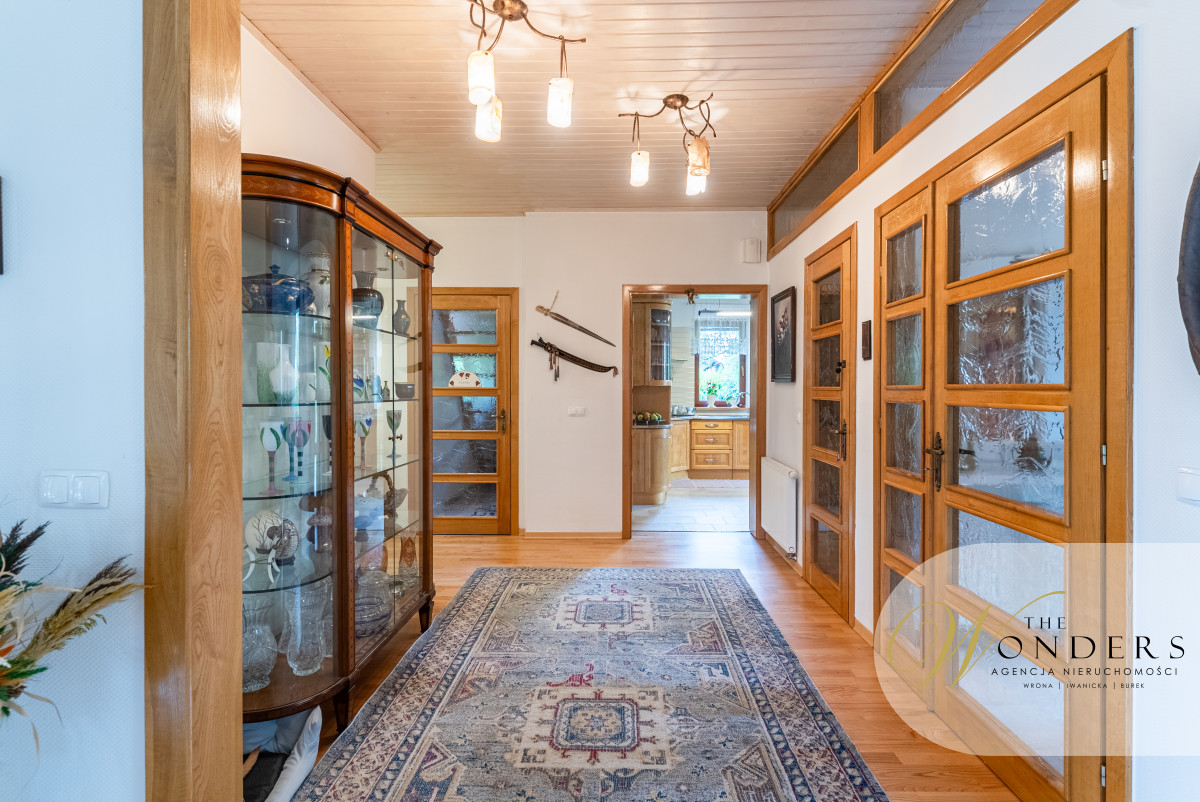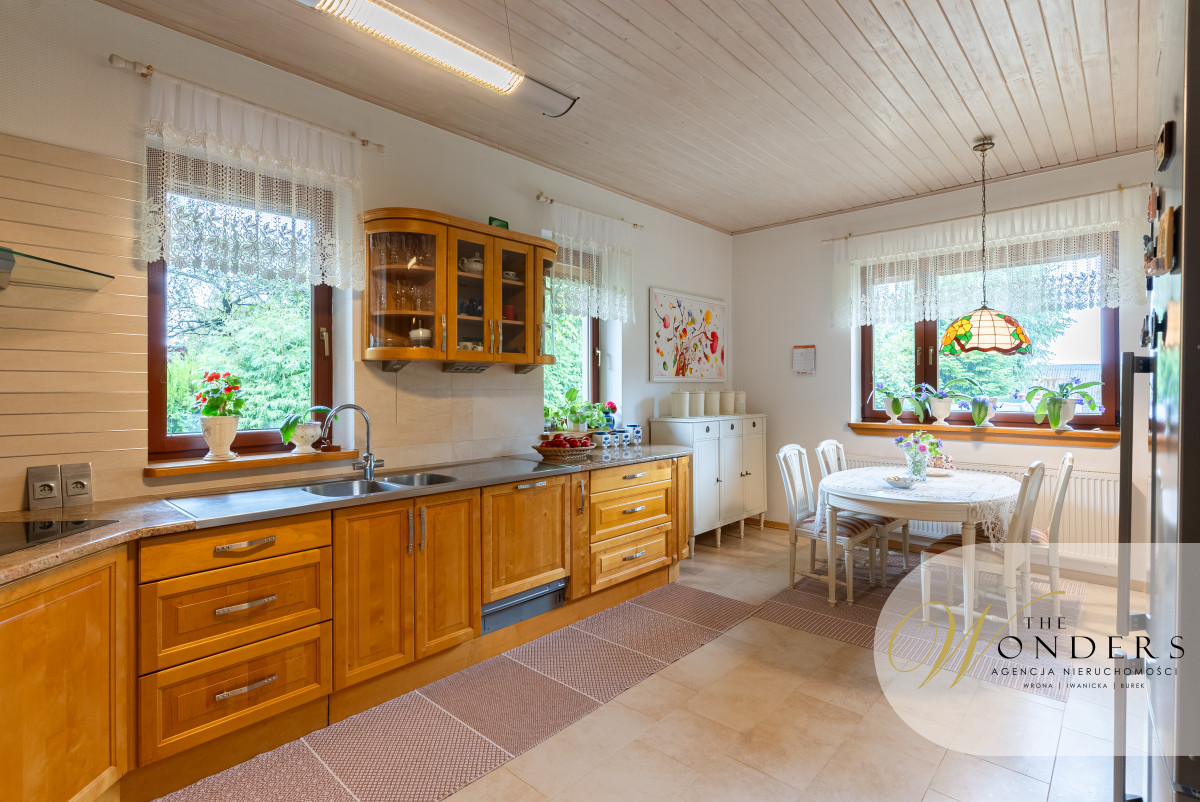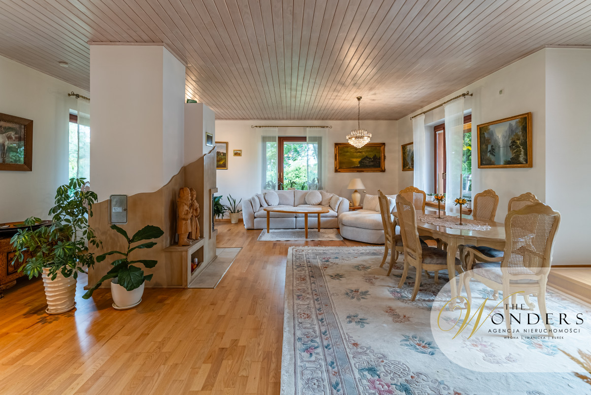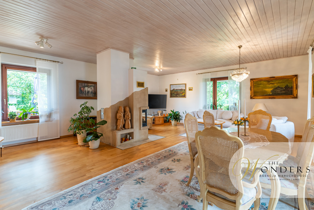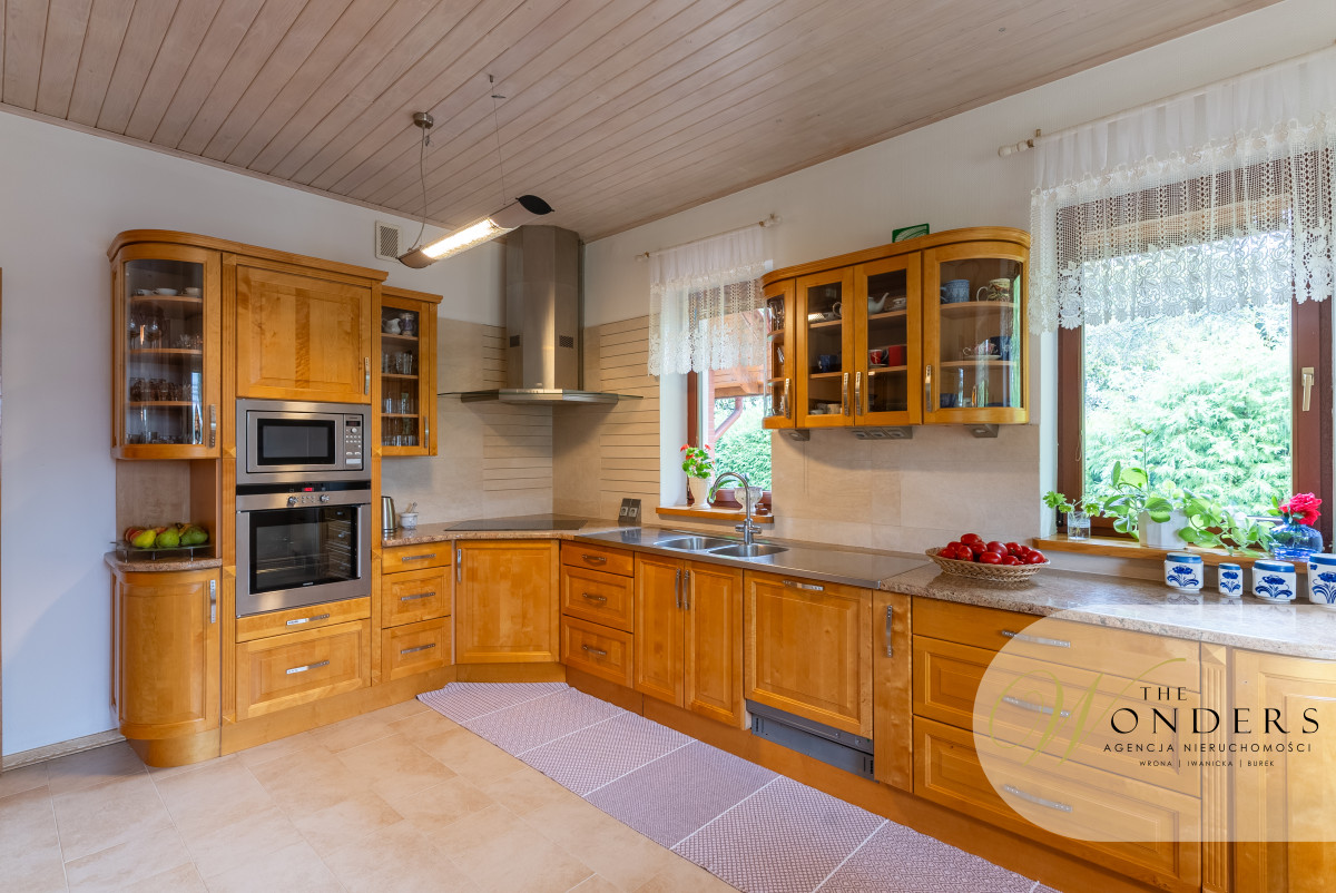Nieruchomość urzeka detalami - drewno najwyższej jakości użyte do wykończenia stolarki okiennej i drzwiowej, przestronne, jasne wnętrza, kominek w salonie o powierzchni 70 m² i kuchnia z pięknymi meblami robionymi na zamówienie tworzą klimat elegancji i ciepła.