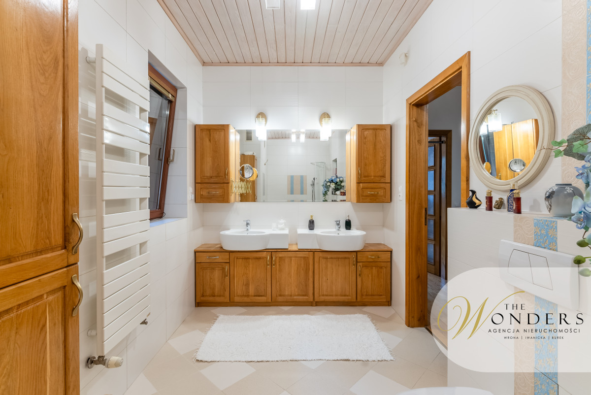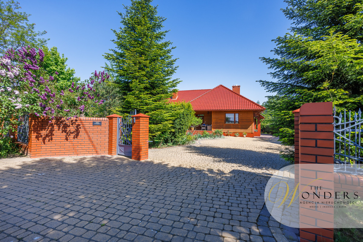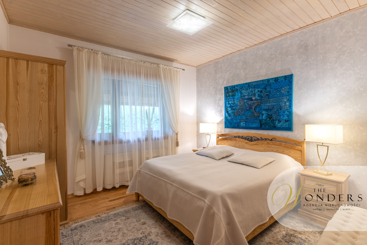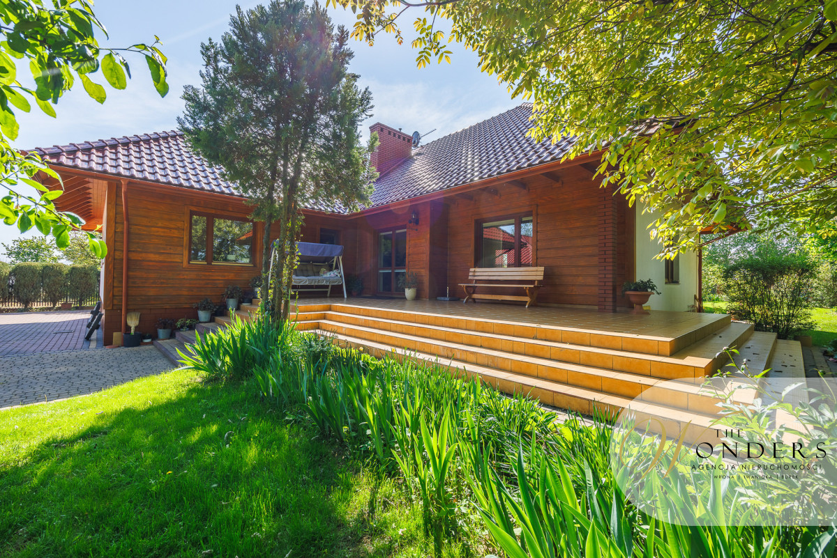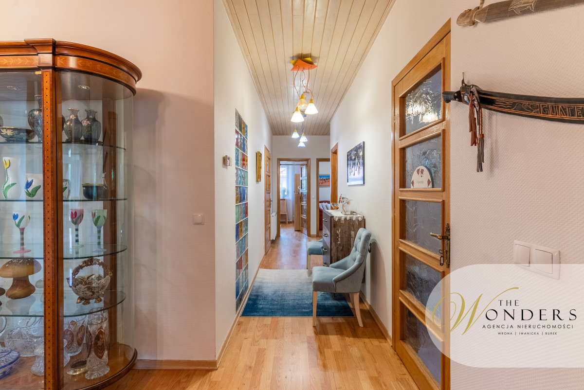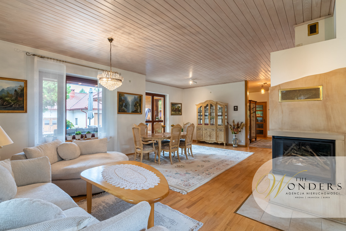 Nieruchomość urzeka detalami - drewno najwyższej jakości użyte do wykończenia stolarki okiennej i drzwiowej, przestronne, jasne wnętrza, kominek w salonie o powierzchni 70 m² i kuchnia z pięknymi meblami robionymi na zamówienie tworzą klimat elegancji i ciepła.