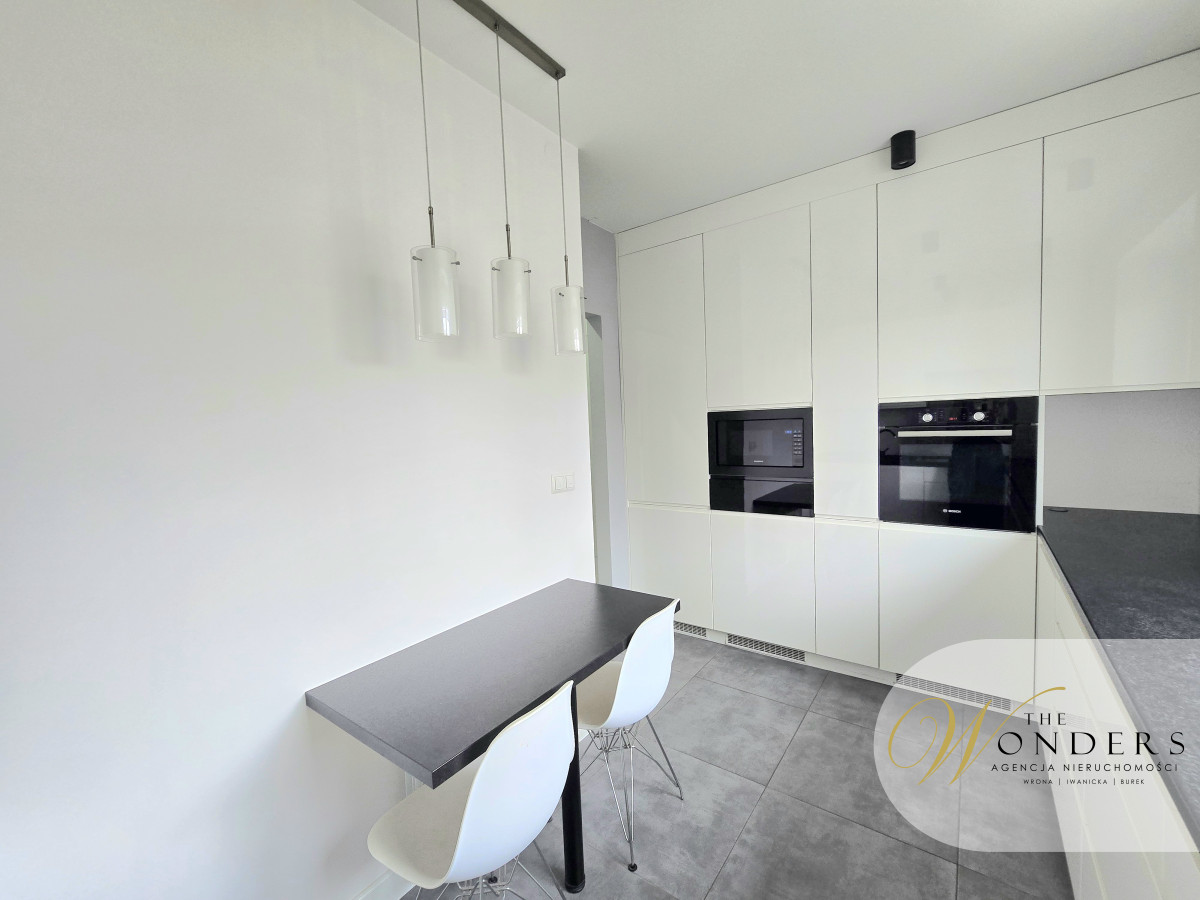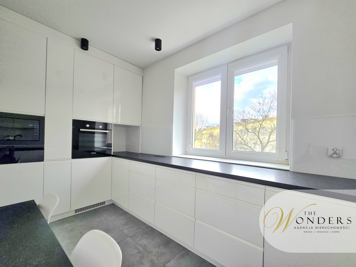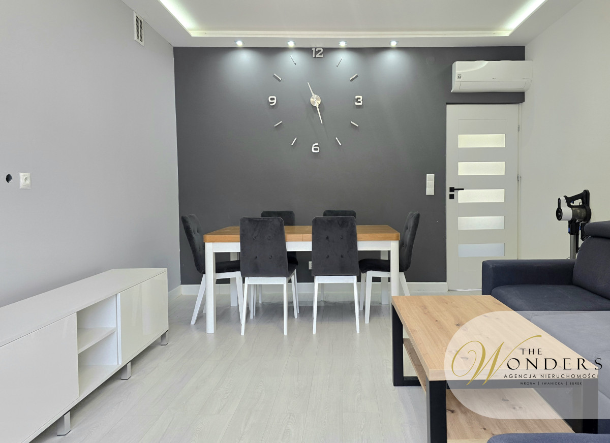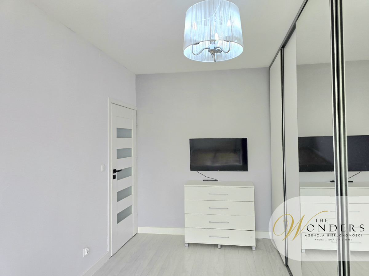 Mieszkanie jest po generalnym remoncie, urządzone i wyposażone w sposób umożliwiający natychmiastowe zamieszkanie. Kuchnia, przestronna z oknem, meble wykonane pod wymiar, sprzęty takie jak: płyta indukcyjna, zmywarka 45cm, lodówka w zabudowie, piekarnik, mikrofalówka w zabudowie. Salon z oknem balkonowym od strony parku. Wyposażony w narożnik, stół z sześcioma krzesłami, stolik oraz szafka RTV. W salonie zamontowana jest klimatyzacja. Sypialnia z szafą w zabudowie na całej szerokości pokoju, łóżko, szafka RTV oraz telewizor. Przedpokój z zabudową: szafa plus miejsce do siedzenia. Łazienka z wanną plus możliwość prysznica, toaleta, umywalka, pralka.