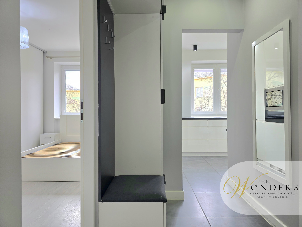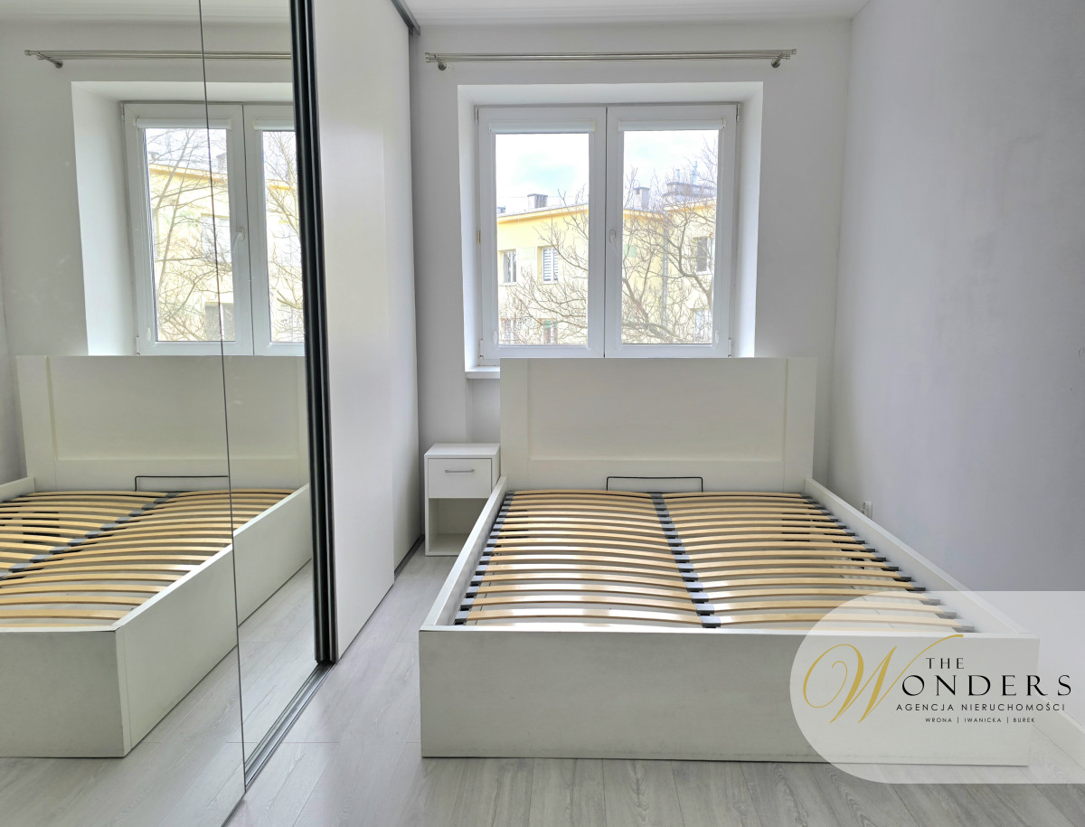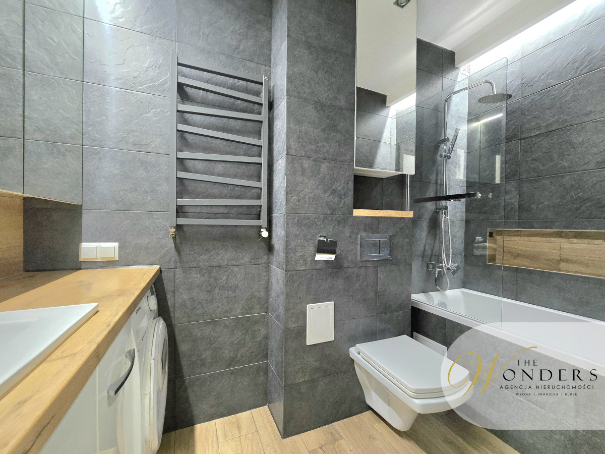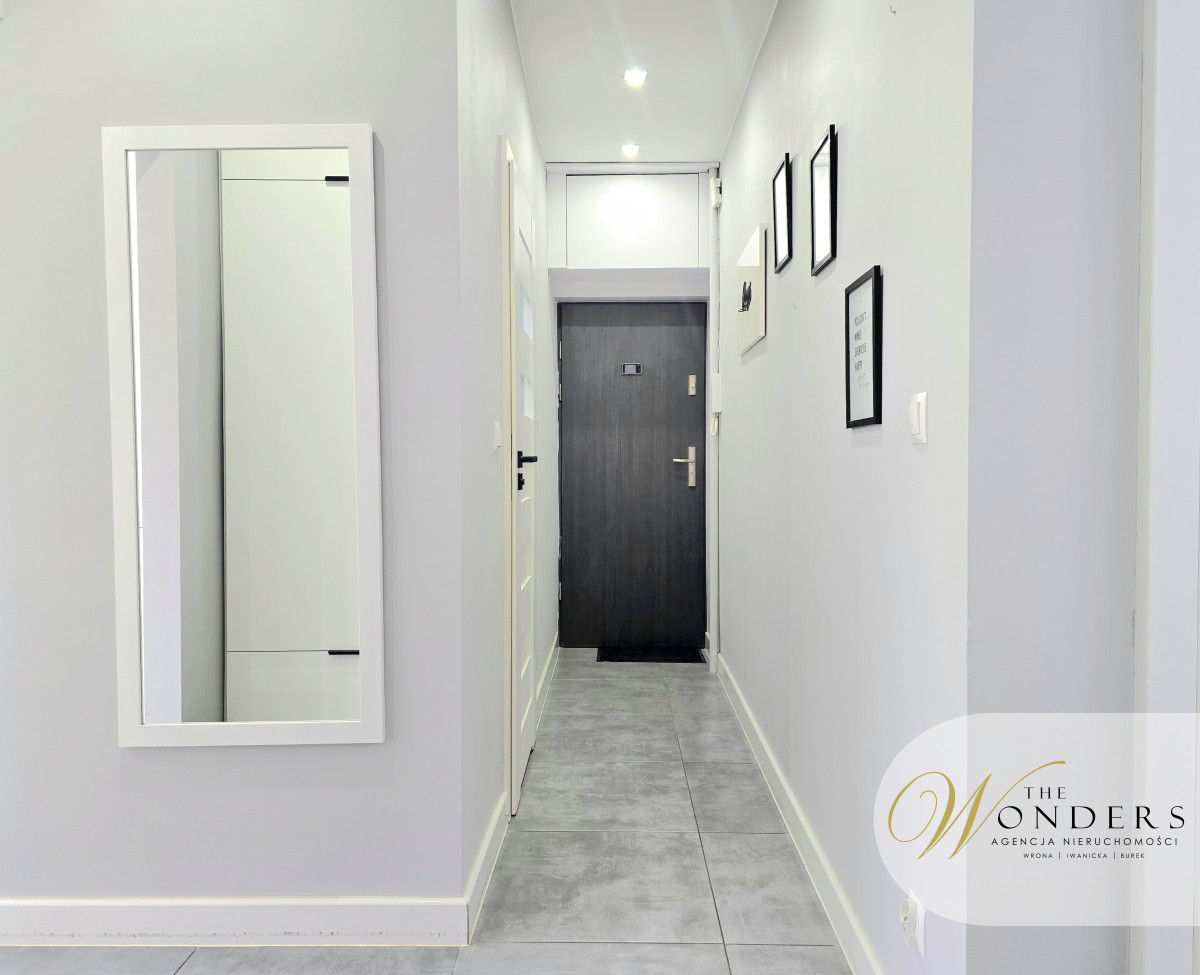 Mieszkanie jest po generalnym remoncie, urządzone i wyposażone w sposób umożliwiający natychmiastowe zamieszkanie. Kuchnia, przestronna z oknem, meble wykonane pod wymiar, sprzęty takie jak: płyta indukcyjna, zmywarka 45cm, lodówka w zabudowie, piekarnik, mikrofalówka w zabudowie. Salon z oknem balkonowym od strony parku. Wyposażony w narożnik, stół z sześcioma krzesłami, stolik oraz szafka RTV. W salonie zamontowana jest klimatyzacja. Sypialnia z szafą w zabudowie na całej szerokości pokoju, łóżko, szafka RTV oraz telewizor. Przedpokój z zabudową: szafa plus miejsce do siedzenia. Łazienka z wanną plus możliwość prysznica, toaleta, umywalka, pralka.
